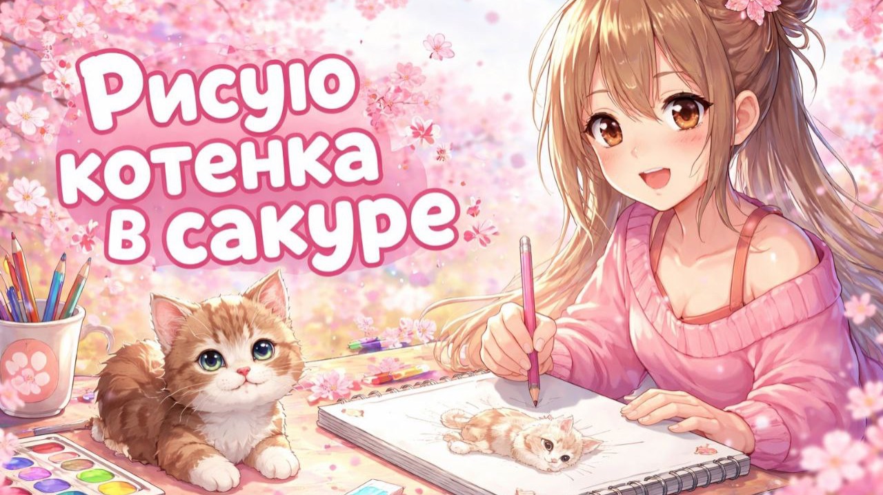 КОТЁНОК И САКУРА | Рисунок цветными карандашами