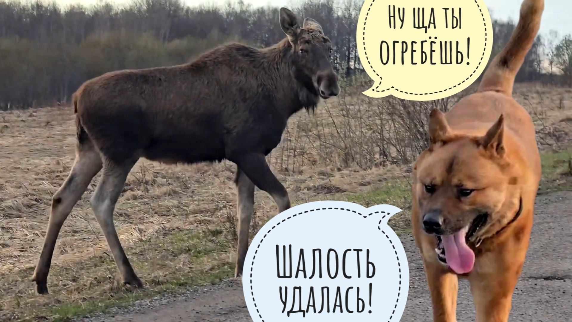 Шутеечки в сторону! Что там с лосём происходило? Обычная вечерняя прогулка с Псом Кубиком по въездной дороге деревни. Лосей на таких прогулках мы встречаем регулярно. Обычно они или игнорируют нас, если далеко, или уходят в лес. В этот раз что-то пошло не так. Пёс Кубик сначала побежал к лосю, потом передумал и побежал к лесу, не тревожа лося. А я шла по дороге, как шла. В самом близком месте от дороги до лося было примерно 80 метров. Это много. На телефон получалось снимать на максимальном 20икратном зуме. Зачем я кричала лосю "Степан!!!"? Так по правилам! Надо обозначать своё присутствие громкими звуками, чтобы дикий зверь издалека увидел, испугался и ушёл. Вроде, лось даже собрался уходить, хоть и не испугался. Но тут появился Кубик и решил показать, что он, вообще-то, тут вольк, а не жук чихнул! А лось решил показать, что он тут, вообще-то, добрый вечер! И пошёл в сторону волька. А вольк пошёл в мою сторону. На дороге мы все встретились. При съёмке видео камера изображение немного отдаляет, поэтому, не очень понятно, что лось от меня был примерно в десяти метрах. Прижатые уши и облизывание говорят об агрессии лося. Я этого не знала про лосей, но знала про лошадей, поэтому, должно и с лосем работать. Потом почитала, оказалось, что так и есть. Понятно стало, что дело совсем дрянь, когда я кинула лосю палку, а он решил мне её вернуть. Или он думал, что это что-то вкусное? Впечатление, что я не первая ему что-то кидала. Бежать было нельзя, поворачиваться к нему спиной тоже. А Пёс Кубик откровенно развлекался, судя по всему. Зачем я облаяла лося? А я слова цензурные все забыла. И подумала, что собак он должен бояться, забыв, что лай Кубика лося не впечатлил. В общем, мне нечего было сказать, и ещё я надеялась, что Куб подключится к моему монологу. Закончилось всё хорошо, мы с Кубом вернулись домой без лося. Когда ждать ответный визит? И что думали мимопроезжающие дальнобойщики, видя всю эту сцену с трассы? Мои каналы в Телеграм для дополненной реальности мира вокруг совы филина Ёлки: https://t.me/nika_zubra - про все текущие дела, новости и обсуждения https://t.me/yollphoto - красивые фото природы и животных моего авторства https://t.me/yollgarden - про мой сад и домашние растения Заходите, смотрите, оставайтесь, если понравится!