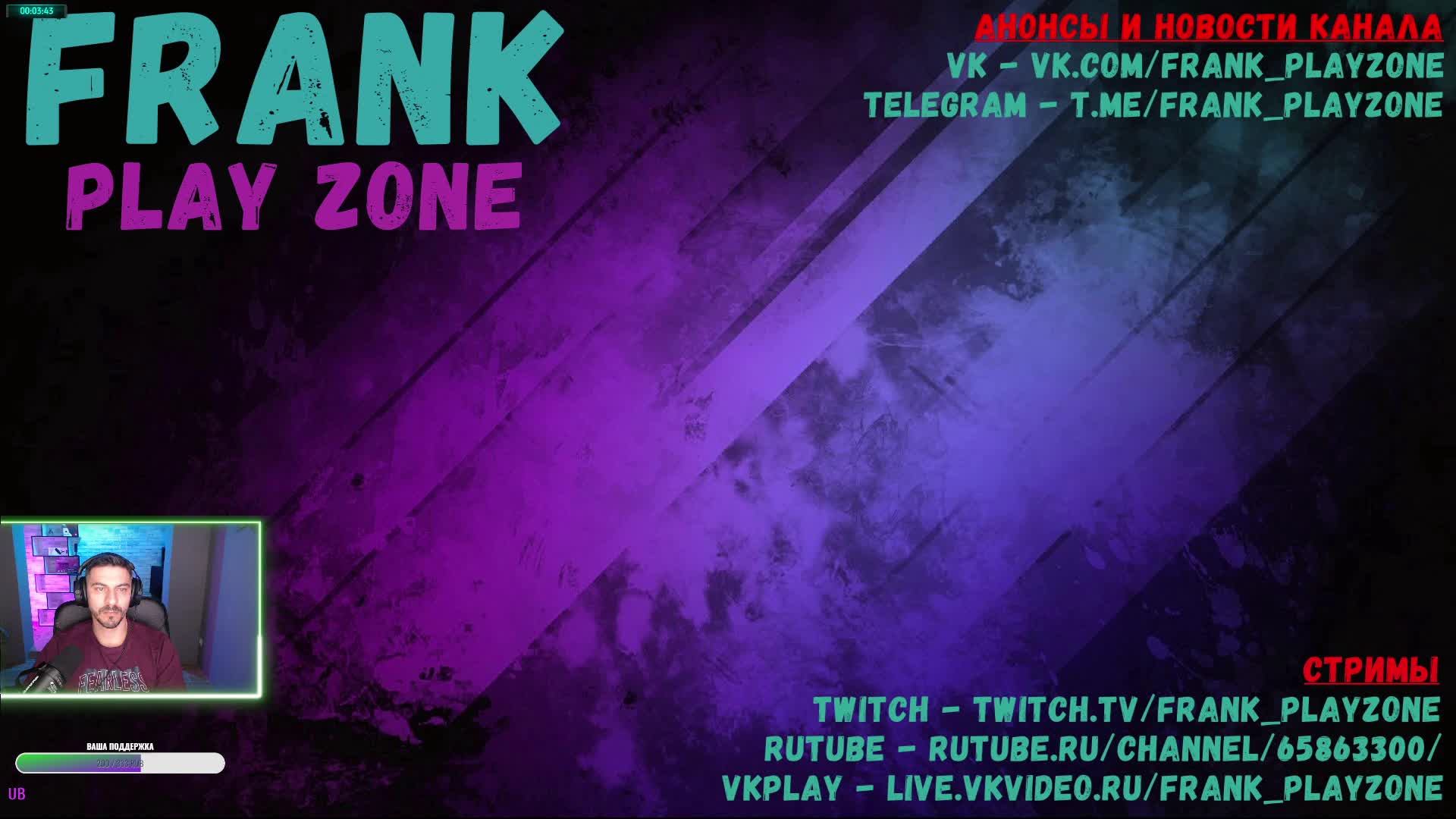 Добро пожаловать на канал Frank Play Zone! 🚚🎮 Здесь вы найдете увлекательные стримы, а также уютное сообщество любителей игр и приятных ламповых трансляций с общением. Мы создаем атмосферу тепла и дружелюбия, где каждый сможет расслабиться, пообщаться и поделиться своими впечатлениями. Поддержать автора канала в прямом эфире и вне его: https://www.donationalerts.com/r/frank_playzone Наши трансляции проходят на Twitch, VKplay и RuTube — выбирайте удобную платформу и присоединяйтесь к нам в любое время! VKplay - https://live.vkvideo.ru/frank_playzone Twitch - https://www.twitch.tv/frank_playzone Также у нас есть группы в Telegram и VK, где вы найдете свежие новости и анонсы: Telegram - https://t.me/frank_playzone VK - https://vk.com/frank_playzone Подписывайтесь, ставьте лайки и не пропустите новые стримы — вместе сделаем наш канал еще ярче и дружелюбнее!