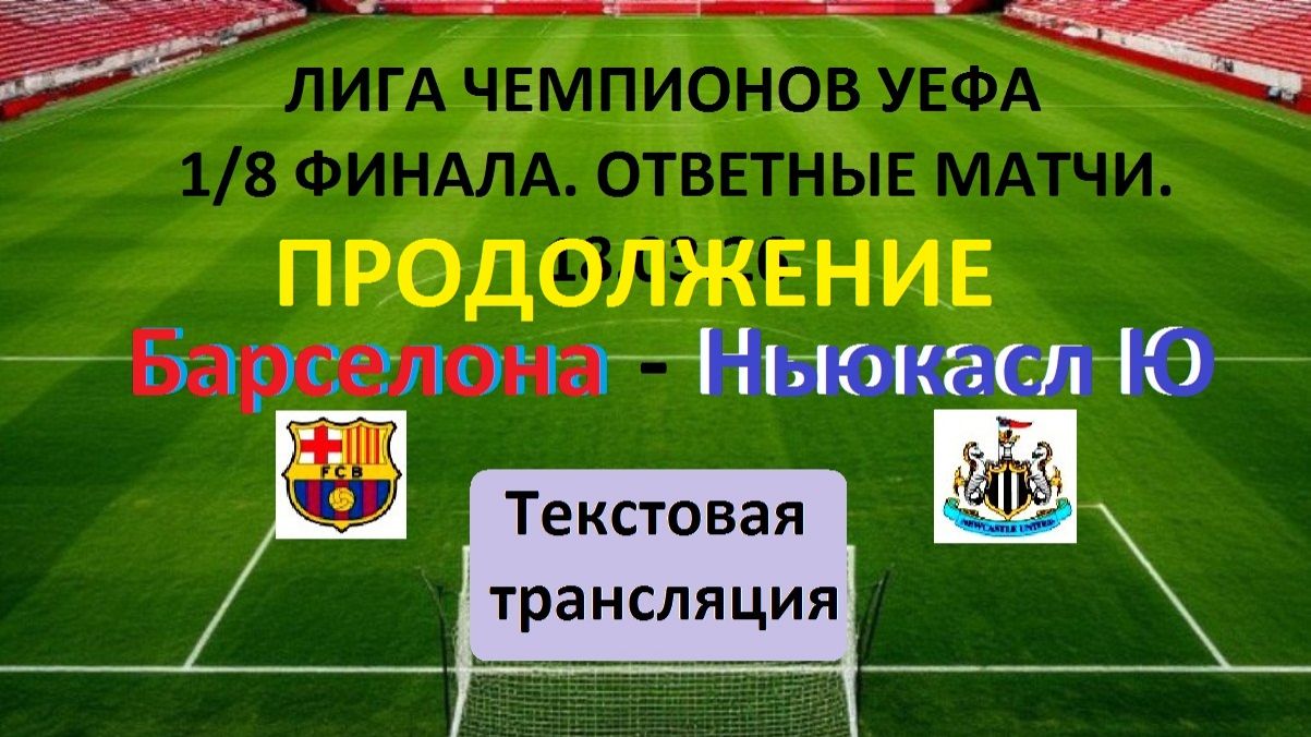 Спорт. ФУТБОЛ. ЛЧ УЕФА. БАРСЕЛОНА - НЬЮКАСЛ ЮНАЙТЕД. 18.03.26. 2-й матч 1/8 Финала. Текстовая трансляция. ПРОДОЛЖЕНИЕ Текстовая трансляция+ Статичные картинки. Главные эпизоды игры. Вспомогательные заставки созданы в https://shedevrum.ai 2-й матч 1/8 Финала Лиги Чемпионов УЕФА между Испанией и Англией. #футбол #Лигачемпионов #БарселонаИспания #НьюкаслАнглия #текст #ЛЧУЕФА #18Марта2026 #текстоваятрансляция #1/8финала #спорт #Прямая трансляция #втораяигра #ответный матч
