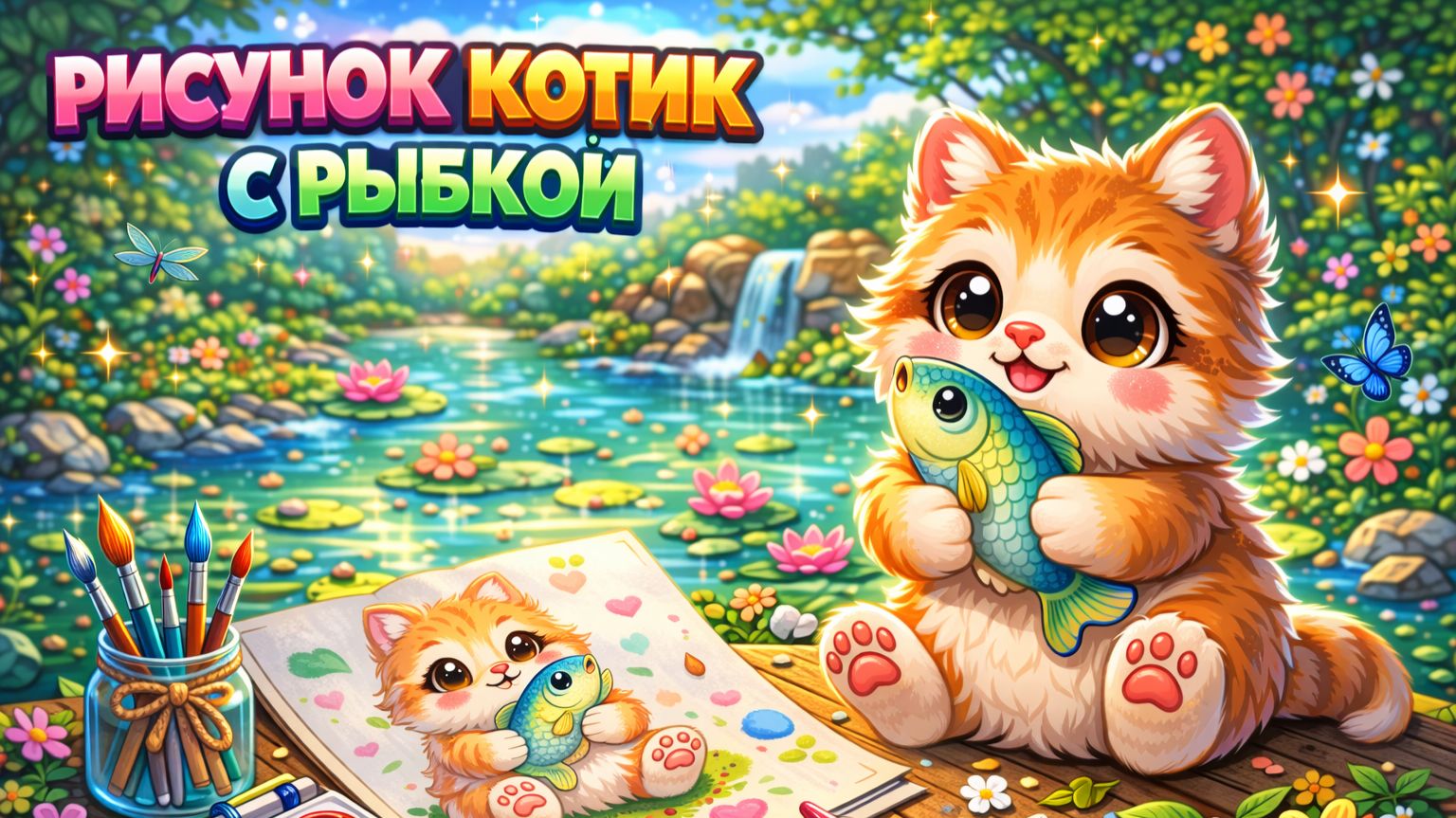 Котик с рыбкой рисунок цветными карандашами